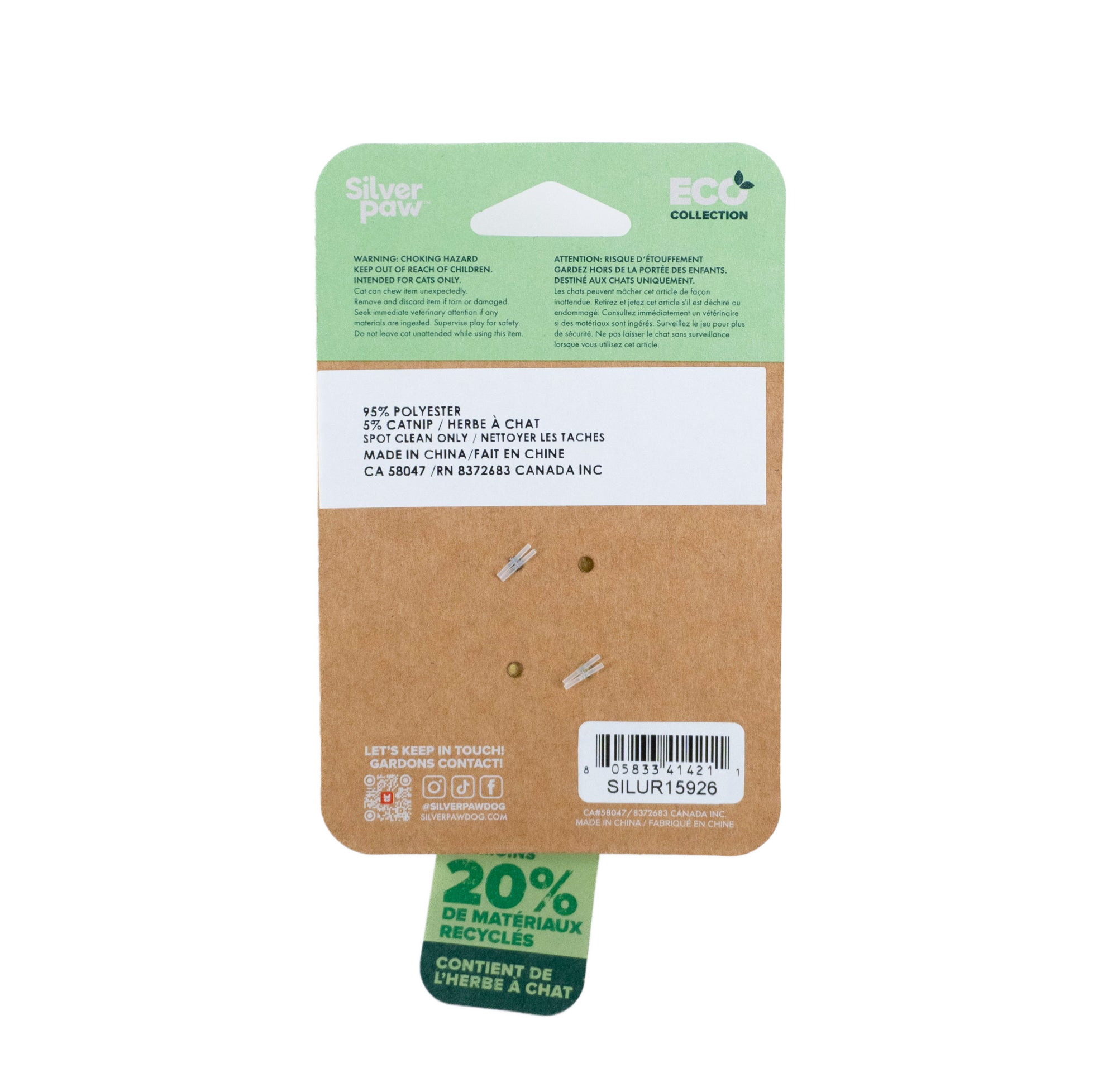 Made from recycled RPET plastic bottles and recycled cotton rope, the toy offers a sustainable yet durable design. The catnip-filled plush body stimulates natural hunting instincts, while the knotted rope legs create extra movement and texture that cats love to bat, tug, and carry.