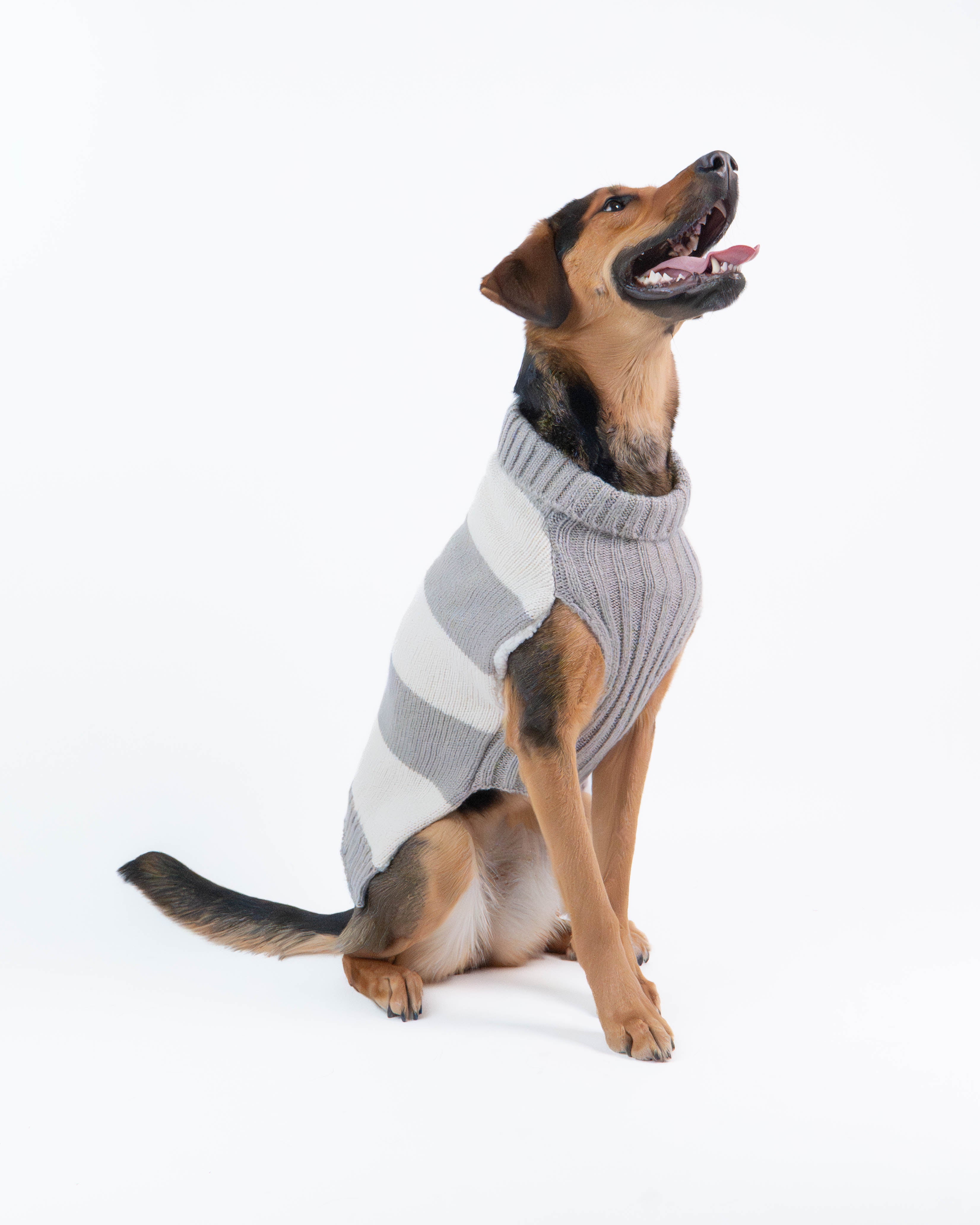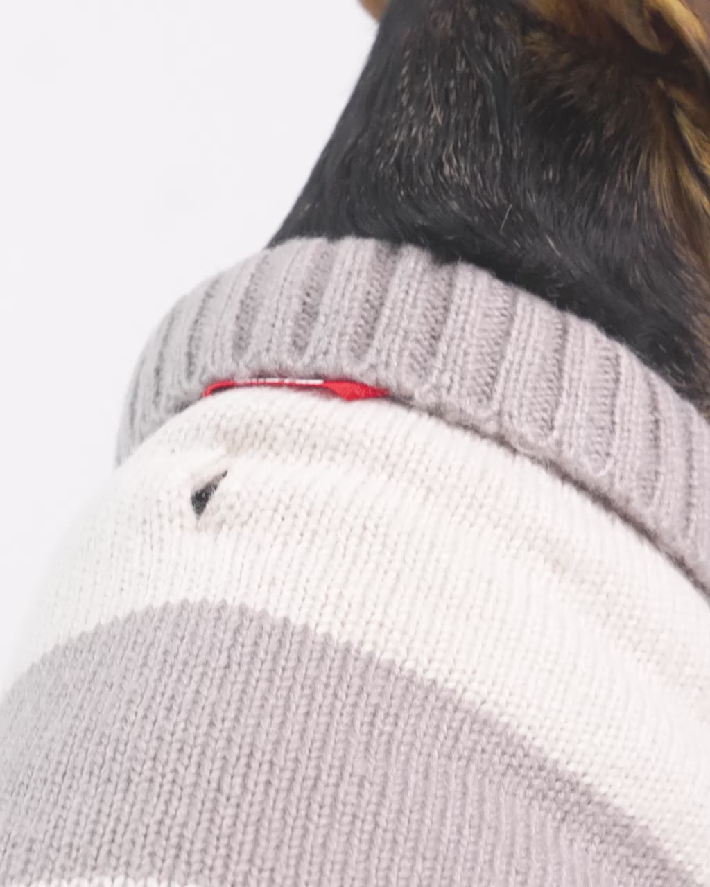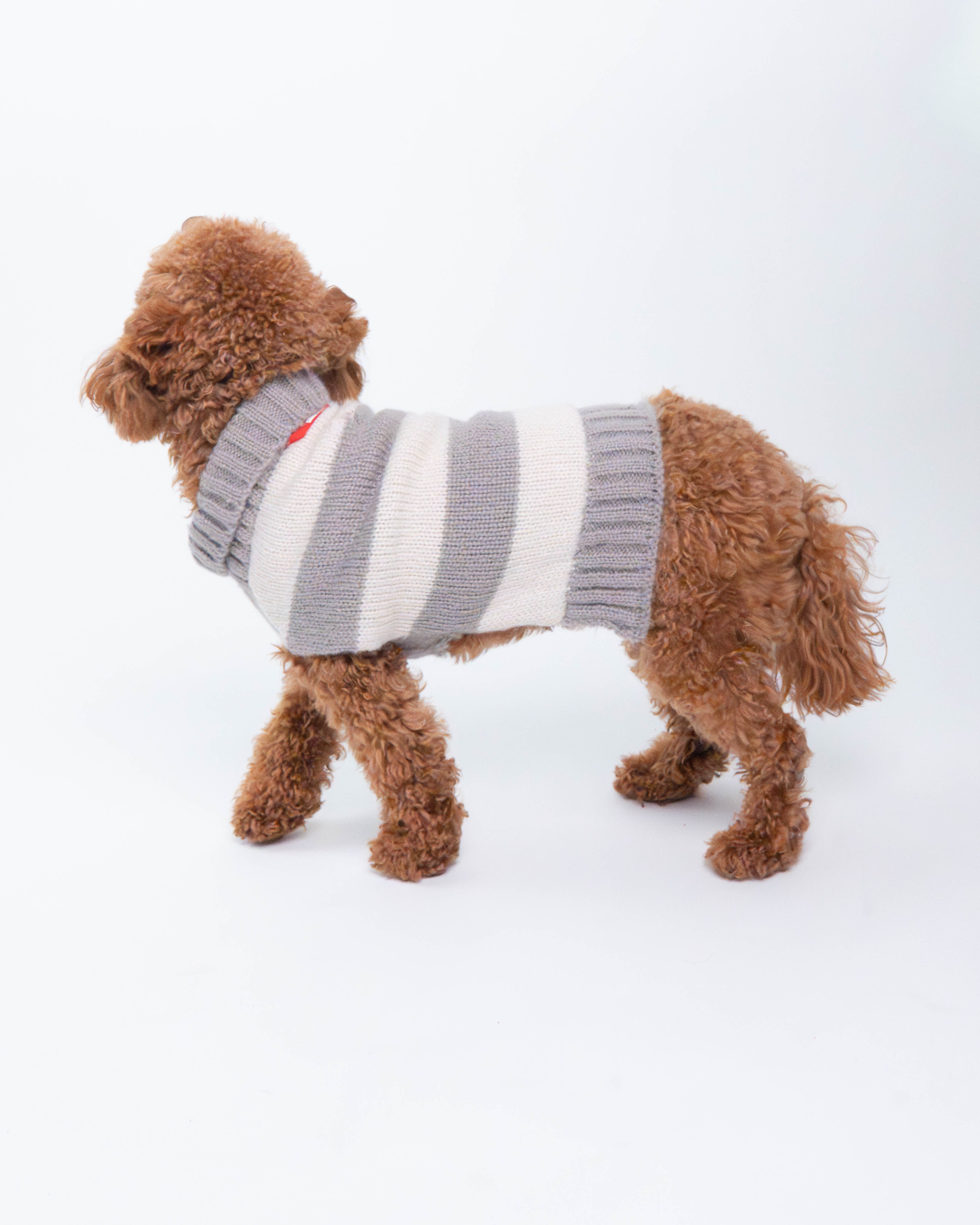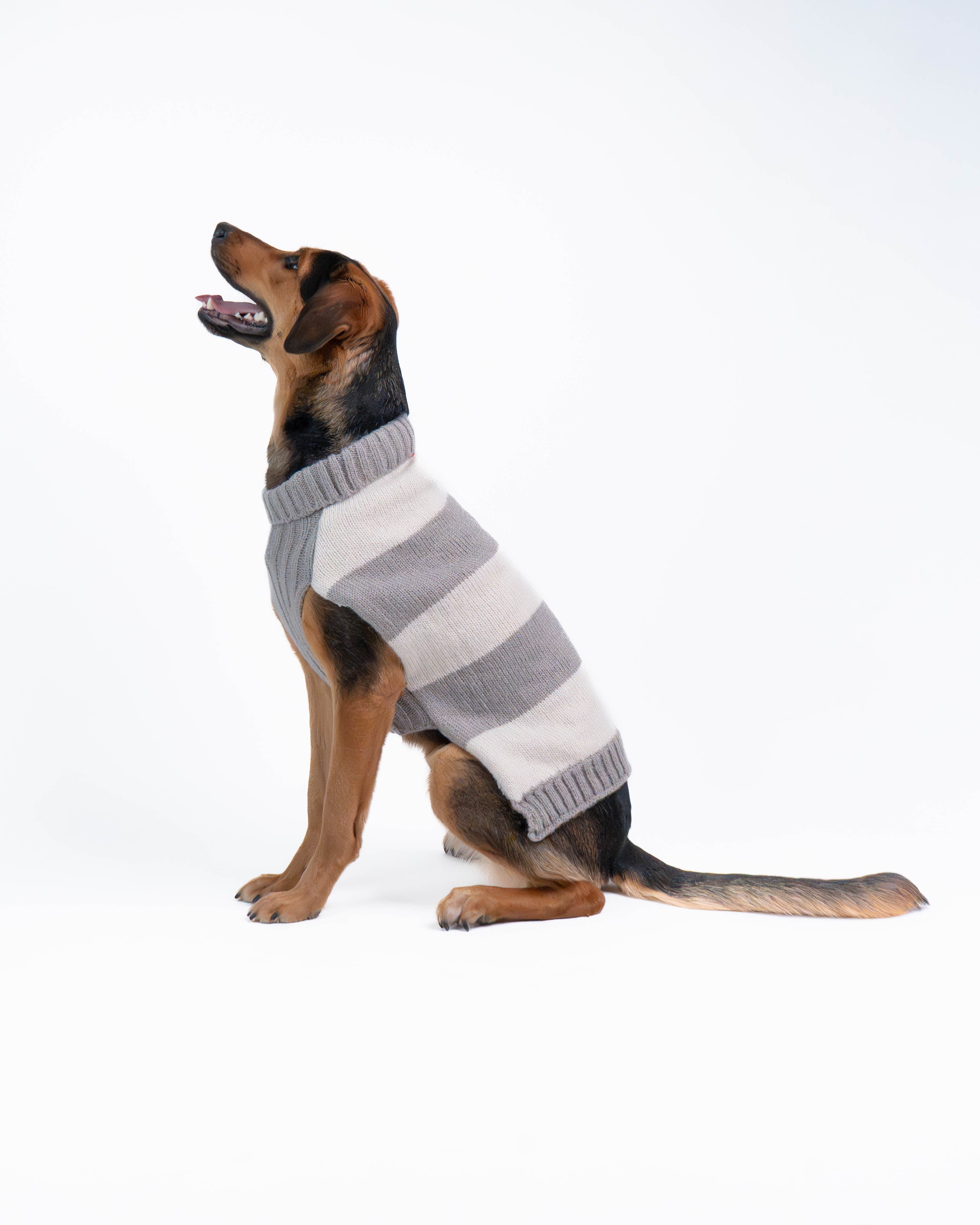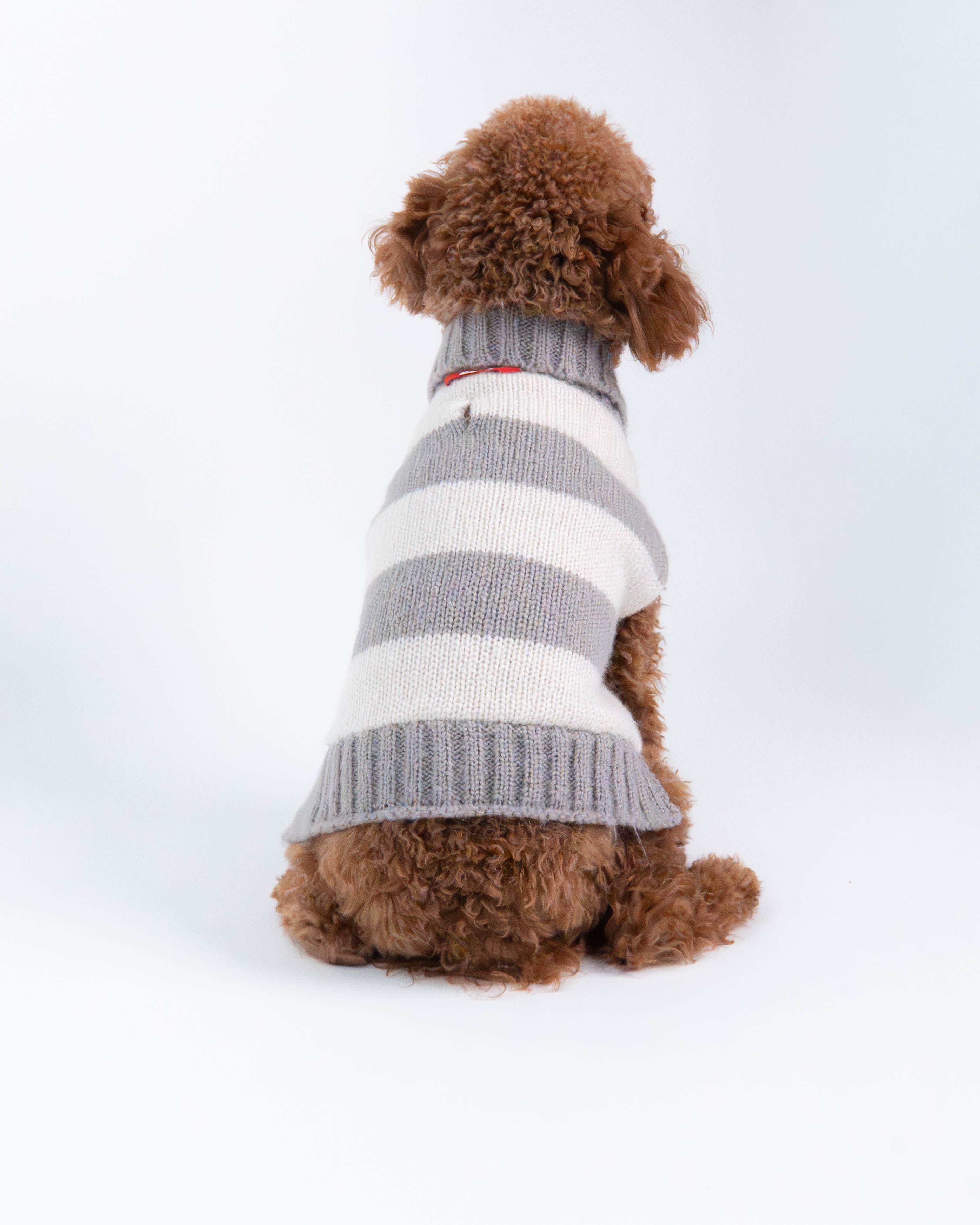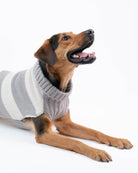 A cozy striped dog sweater in timeless grey and beige tones. Soft, breathable, and designed for everyday comfort — perfect for crisp fall walks and relaxed indoor moments.