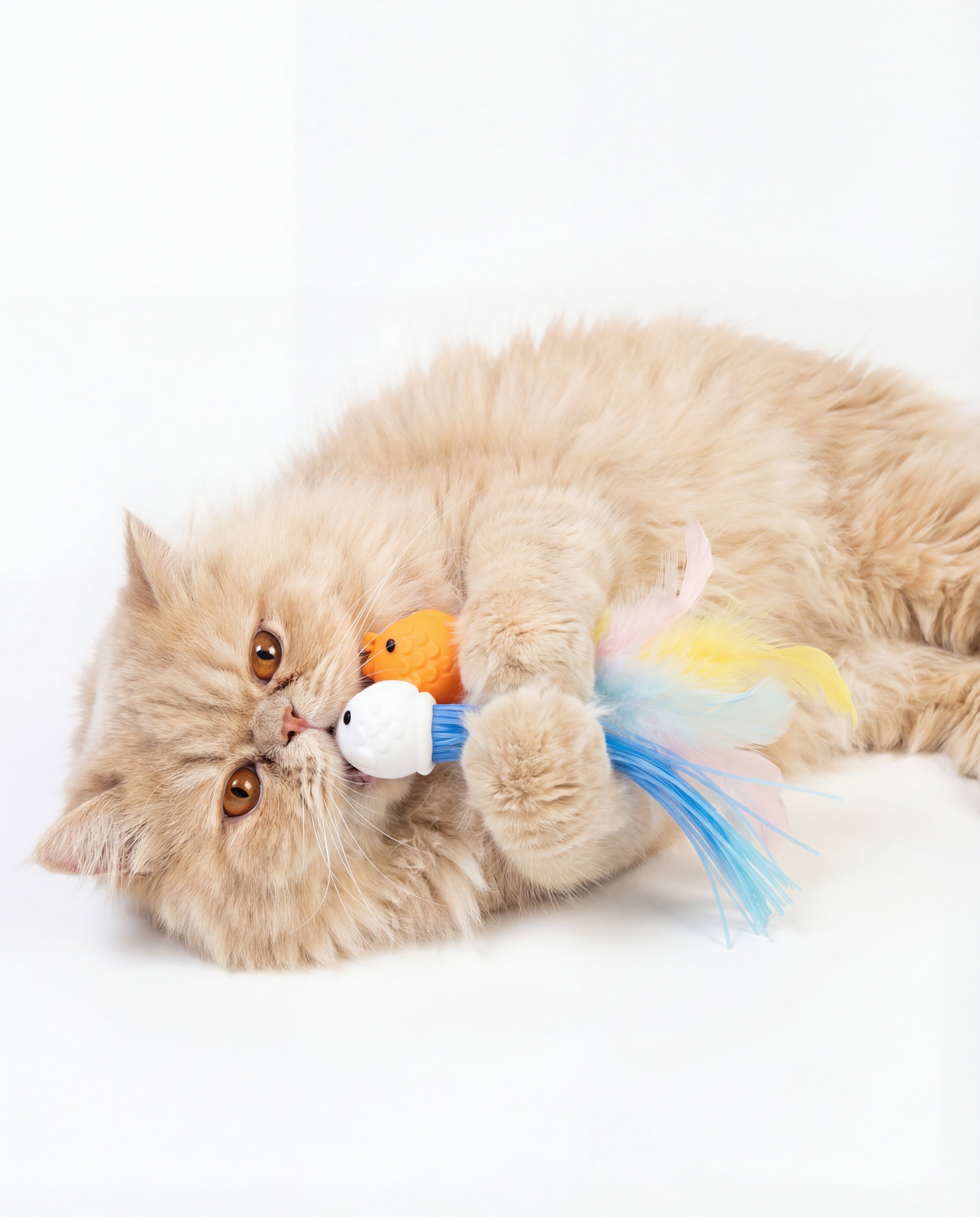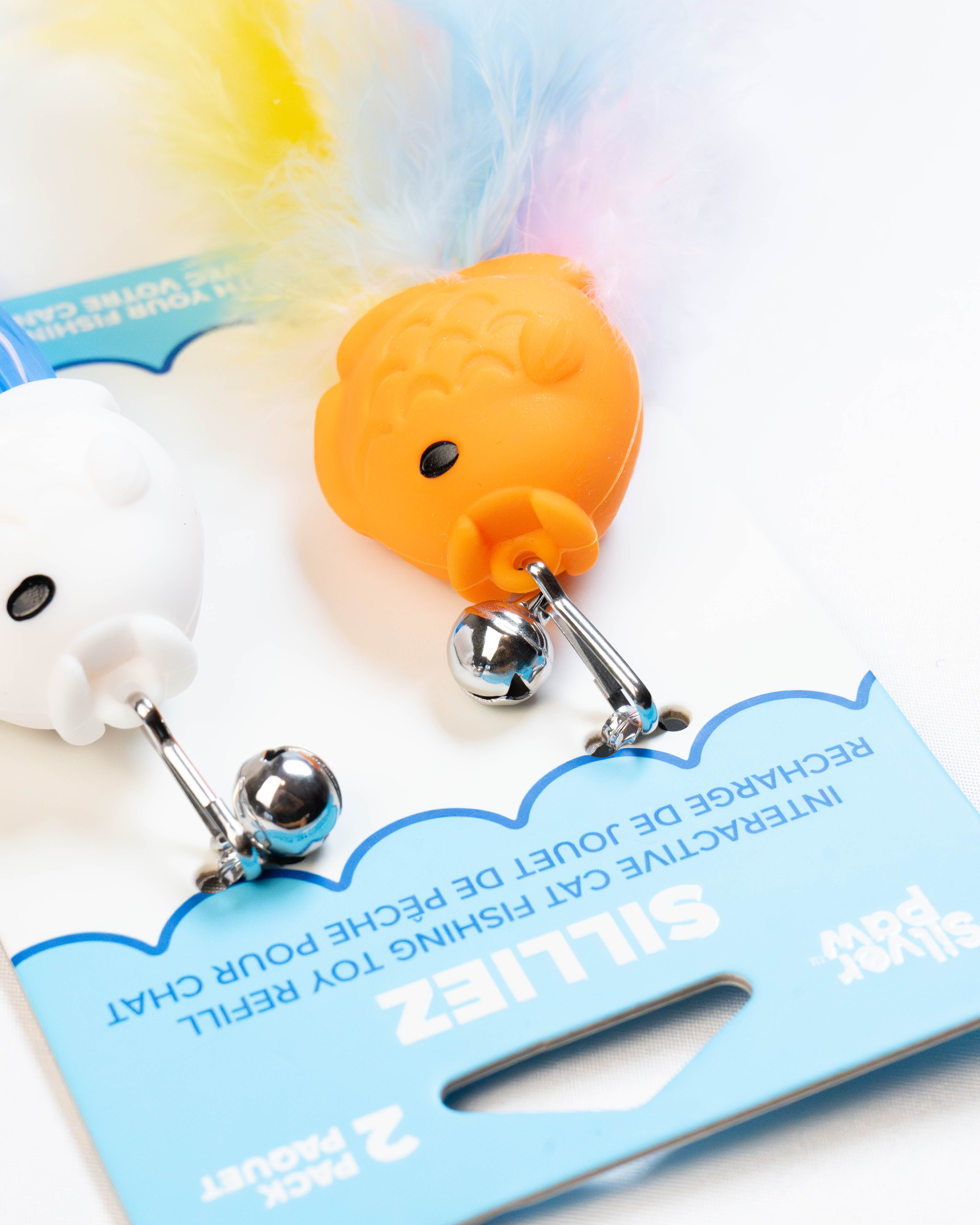 Keep the excitement going with the Silver Paw Silliez Fish Refill Pack! This duo includes two distinct characters—a bright orange fish and a white squid-like friend—designed to refresh your interactive wand play. These attachments combine soft silicone bodies with fluffy feather tails, offering a dual-texture experience that delights a cat's senses.
