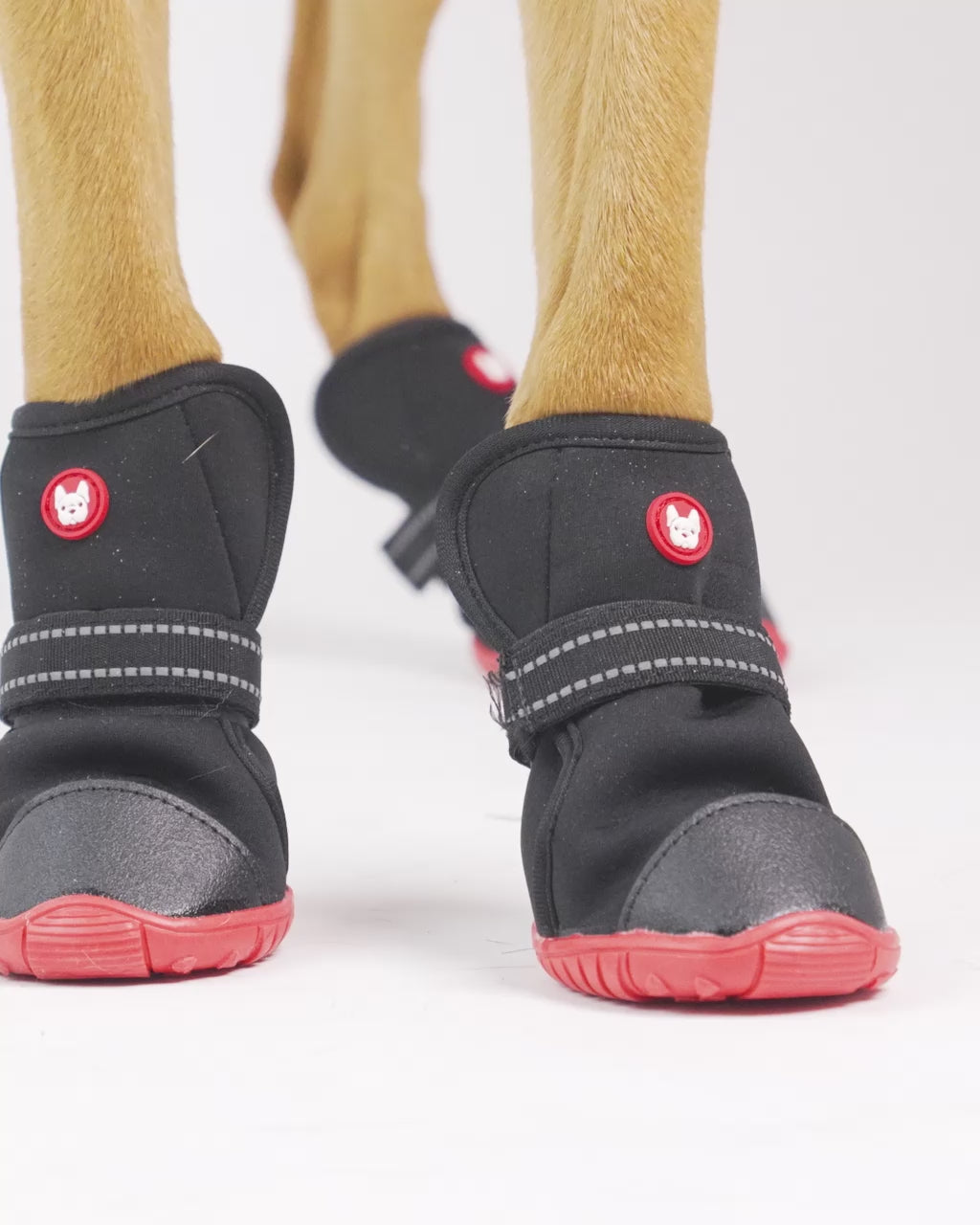 Introducing the Ren Winter Boots — cold-weather dog boots designed to help protect paws from chilly pavement, snowy sidewalks, and slick winter streets. With a snug, insulated feel and a bold black-and-red design, Ren is built for winter walks when warmth, comfort, and traction matter most.